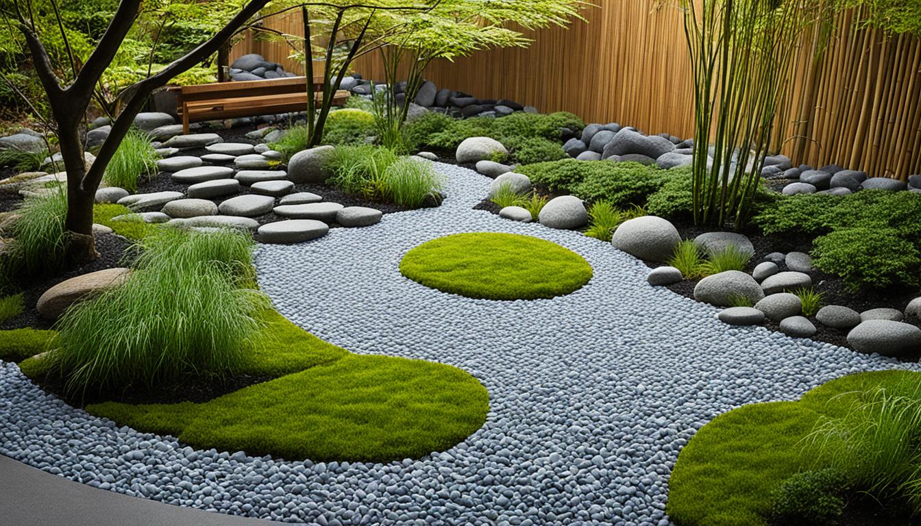 Creating a Zen garden is about finding balance among its elements. Balance and harmony are key in Zen garden design. They guide how rocks, water, plants, and other parts come together. Mastering this balance is key to making a space truly Zen.